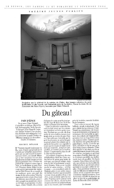 En 2024, à nouveau, nous sommes choyé.e.s d’assister à ces moments de fous rires et à ces émotions vives que suscitent le spectacle Pain d’épice. Au fil des ans, ce sont 40 000 spectateurs et spectatrices qui ont assisté à cette création. Un grand merci au public d'avoir été au rendez-vous pour tous ces souvenirs gravés, pour tous les sourires et rires déployés ainsi que pour tous les biscuits dévorés! Nous souhaitions remercier vivement l'équipe d'accueil essentielle à l'expérience théâtrale ainsi que Claire la pâtissière pour ces 20 ans de partages gourmands!