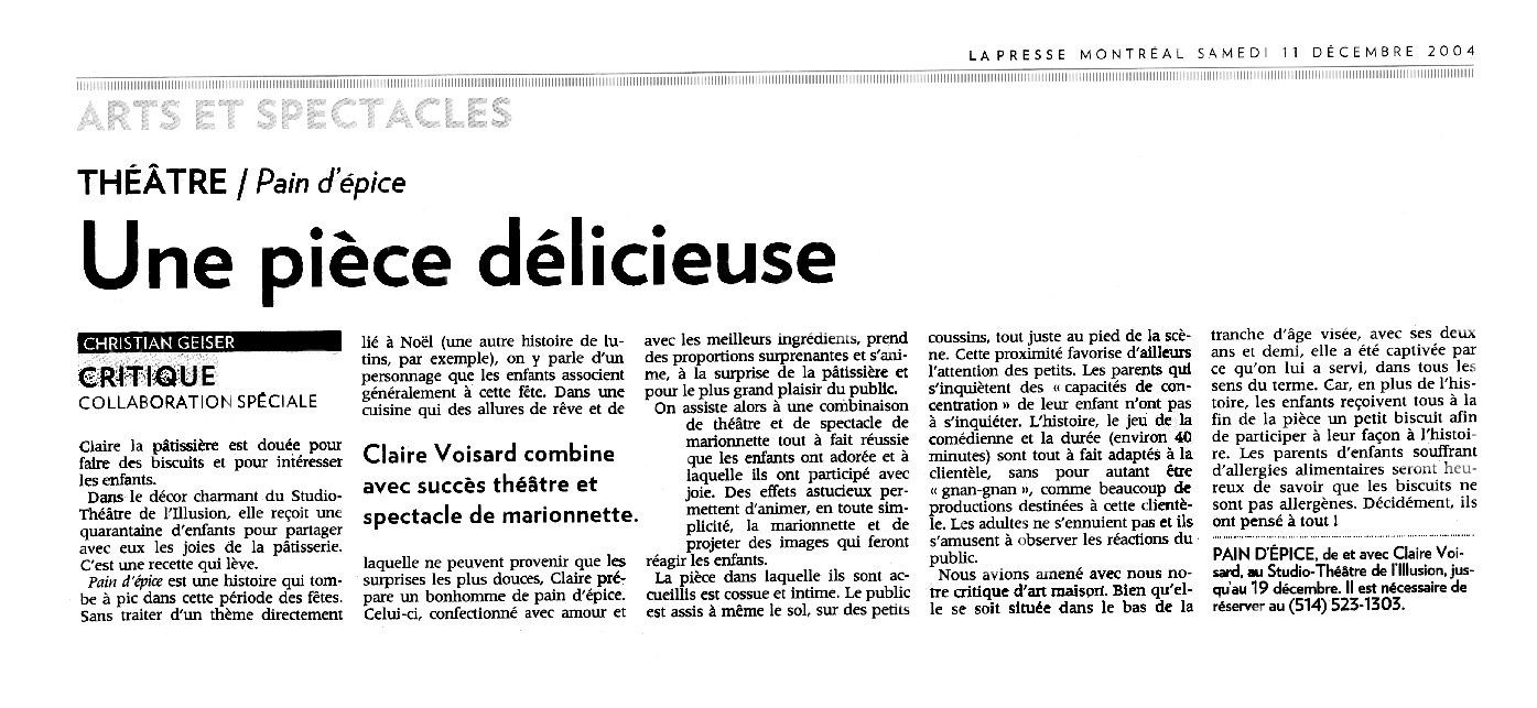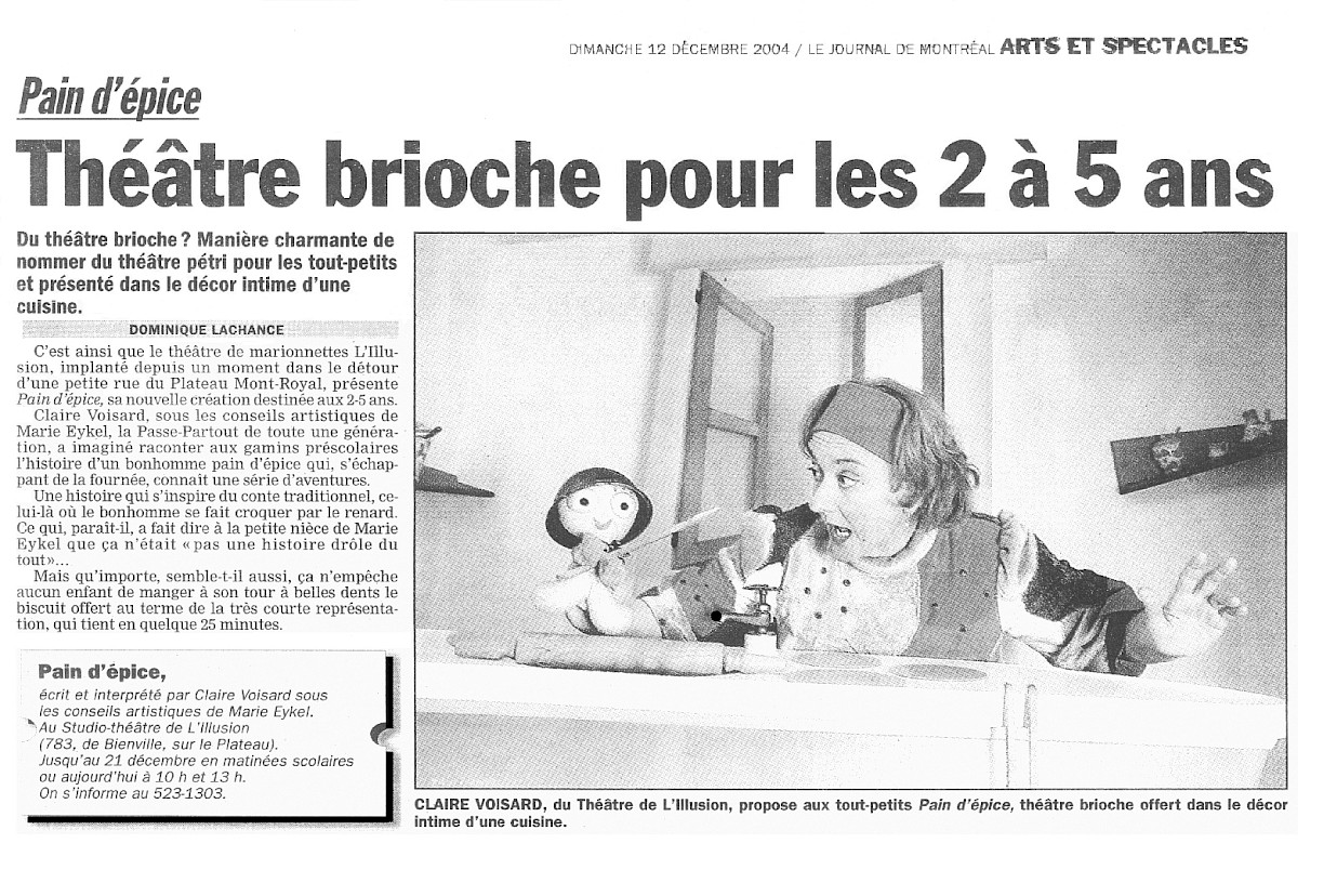 En 2004, notre biscuit prend vie pour la toute première fois à L’Illusion. Pour l’occasion, l’équipe invente une deuxième salle intime à même son espace de création et de diffusion, situé à l’époque sur la rue de Bienville, dans le Plateau Mont-Royal. Le «théâtre brioche» conçu pour accueillir 30 personnes à la fois, présente ainsi une première série de 45 représentations entre le 5 et le 23 décembre 2004 devant un total de 1250 spectateurs et spectatrices. Acclamé par les enfants, les adultes ainsi que la critique, Pain d'épice connu déjà un grand succès et fit salle comble à toutes les représentations!