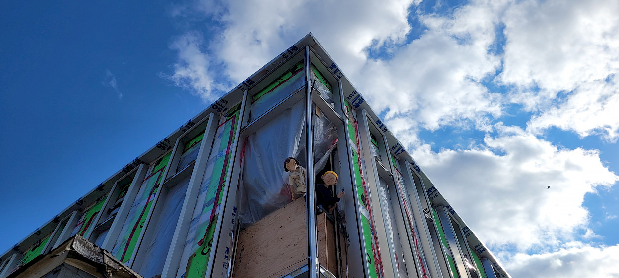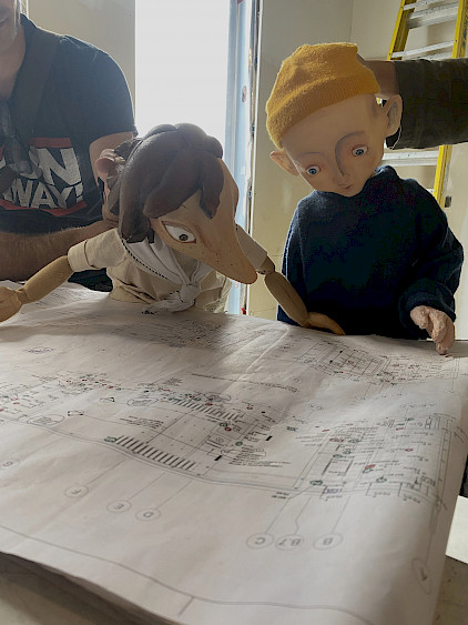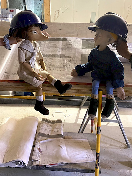 Tinamer et Coco ont accompagné les membres de l'équipe de L'Illusion pour découvrir l'intérieur de l'édifice lors d'une visite de chantier. C'est avec beaucoup d'attention que les deux marionnettes du spectacle Conte du Littoral ont observé les plans pour s'assurer du bon déroulement de la construction. Coco et Tinamer ont aussi passé beaucoup de temps à observer par la fenêtre ce que sera la vue depuis les nouveaux bureaux. Les apercevez-vous, installés à la proue de l’édifice, prêts à s’élancer vers de grandes aventures?