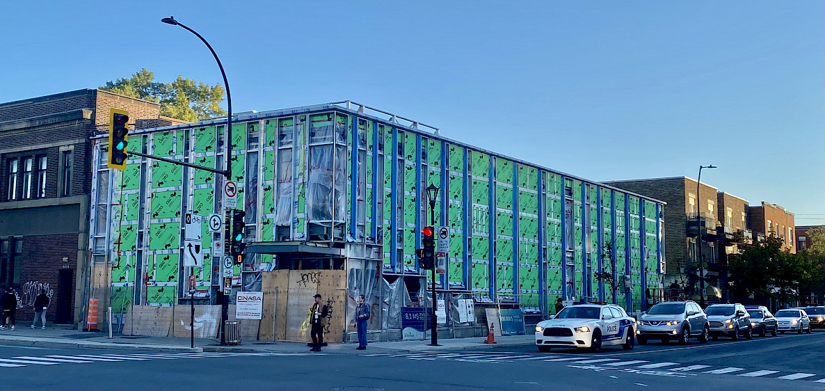 Depuis l'angle des rues Saint-Denis et Beaubien, la façade de L'Illusion, Espace de création et de diffusion dédié aux arts de la marionnette laisse maintenant apparaitre les premières lignes du plan architectural. Vous remarquerez sûrement celles du mur rideau, auquel il ne manque que les briques rouges pour dessiner ce qui sera la porte d'entrée vers un nouvel espace plein de découvertes.