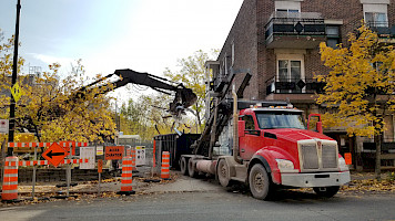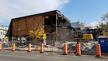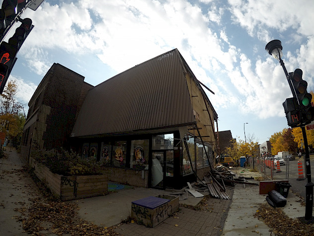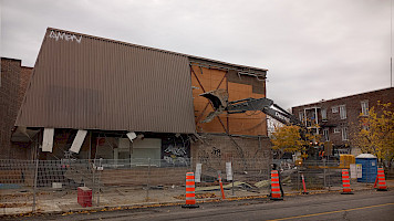 La première étape du projet de construction est impressionnante et symbolique. Le 22 octobre dernier, au petit matin, l'équipe de construction de L'Illusion s'installe au coin des rues St-Denis et Beaubien. C’est le début de la démolition du bâtiment actuel. Plusieurs de nos voisin.e.s se rappellent de l'ancienne vocation de ce bâtiment à la signature architecturale vernaculaire : un toit brun de style champignon et des murs de briques en béton beige!