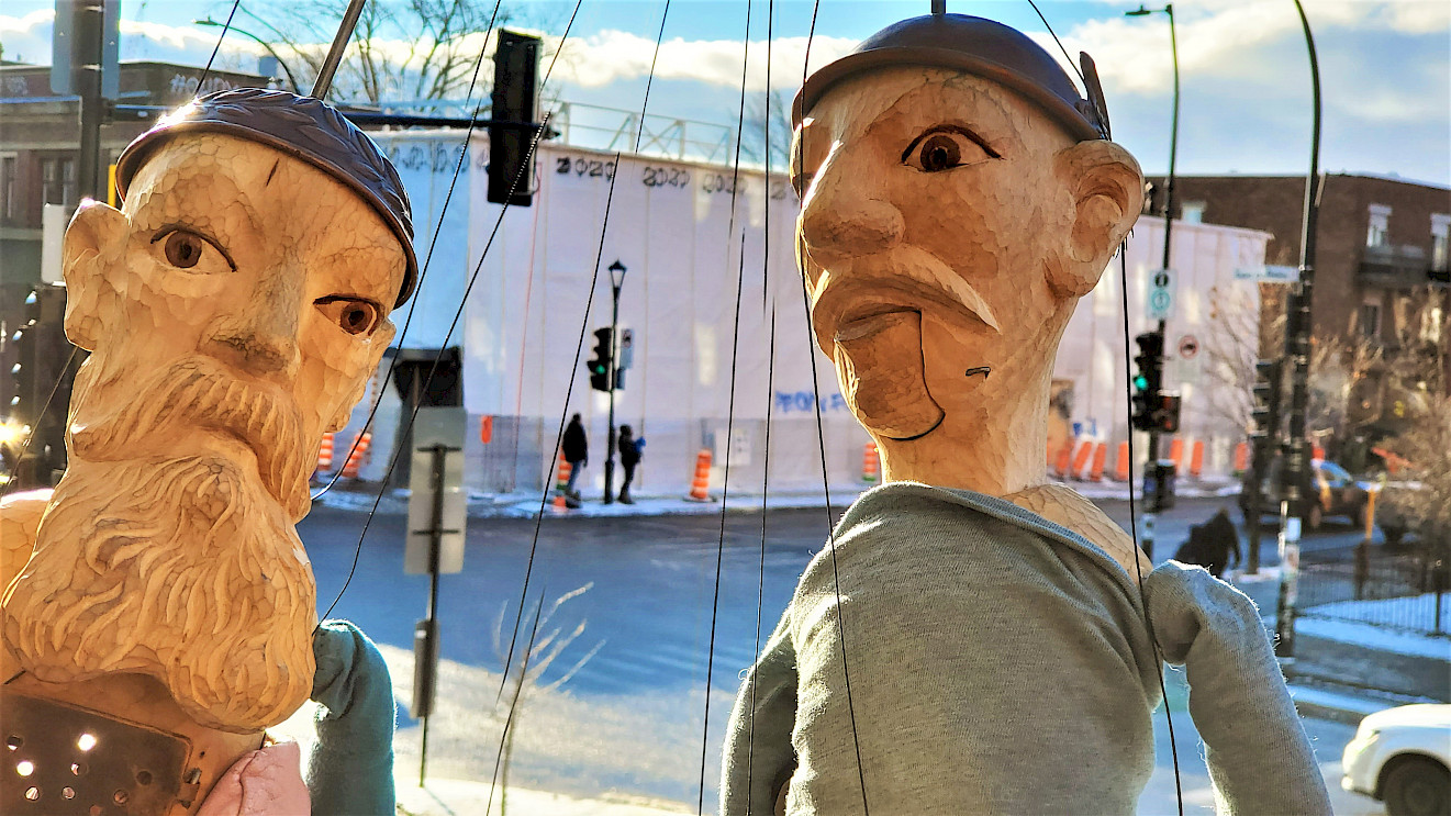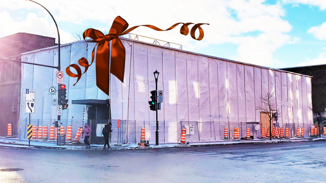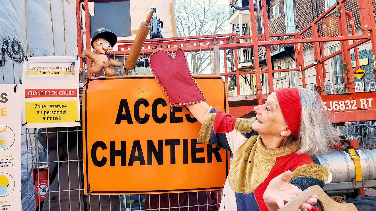 Nous avons donc demandé à Pain d'épice, la plus petite et intrépide des marionnettes d’aller inspecter le chantier juste avant les vacances des fêtes. L’Illusion paré de ce grand voile blanc lui a tout de suite fait penser à un gros cadeau, qu’il a bien hâte de partager avec vous!