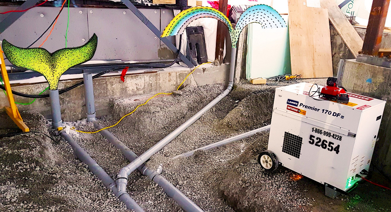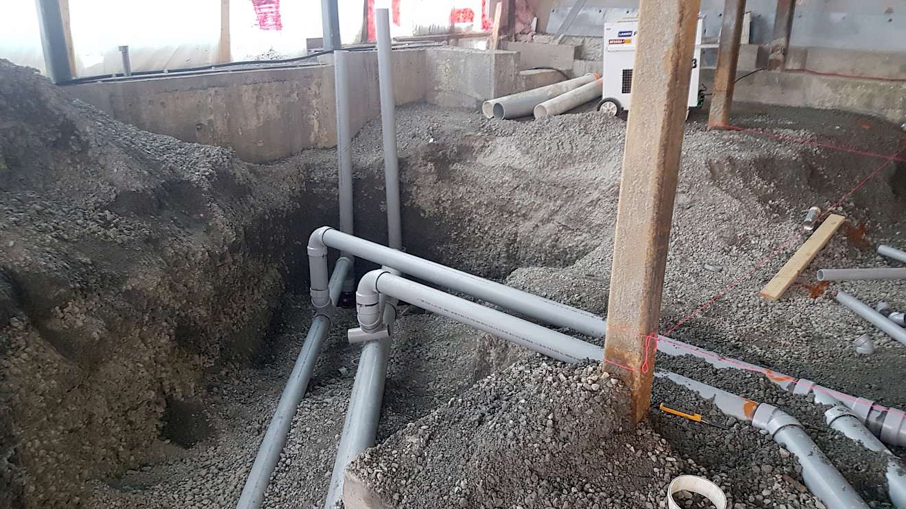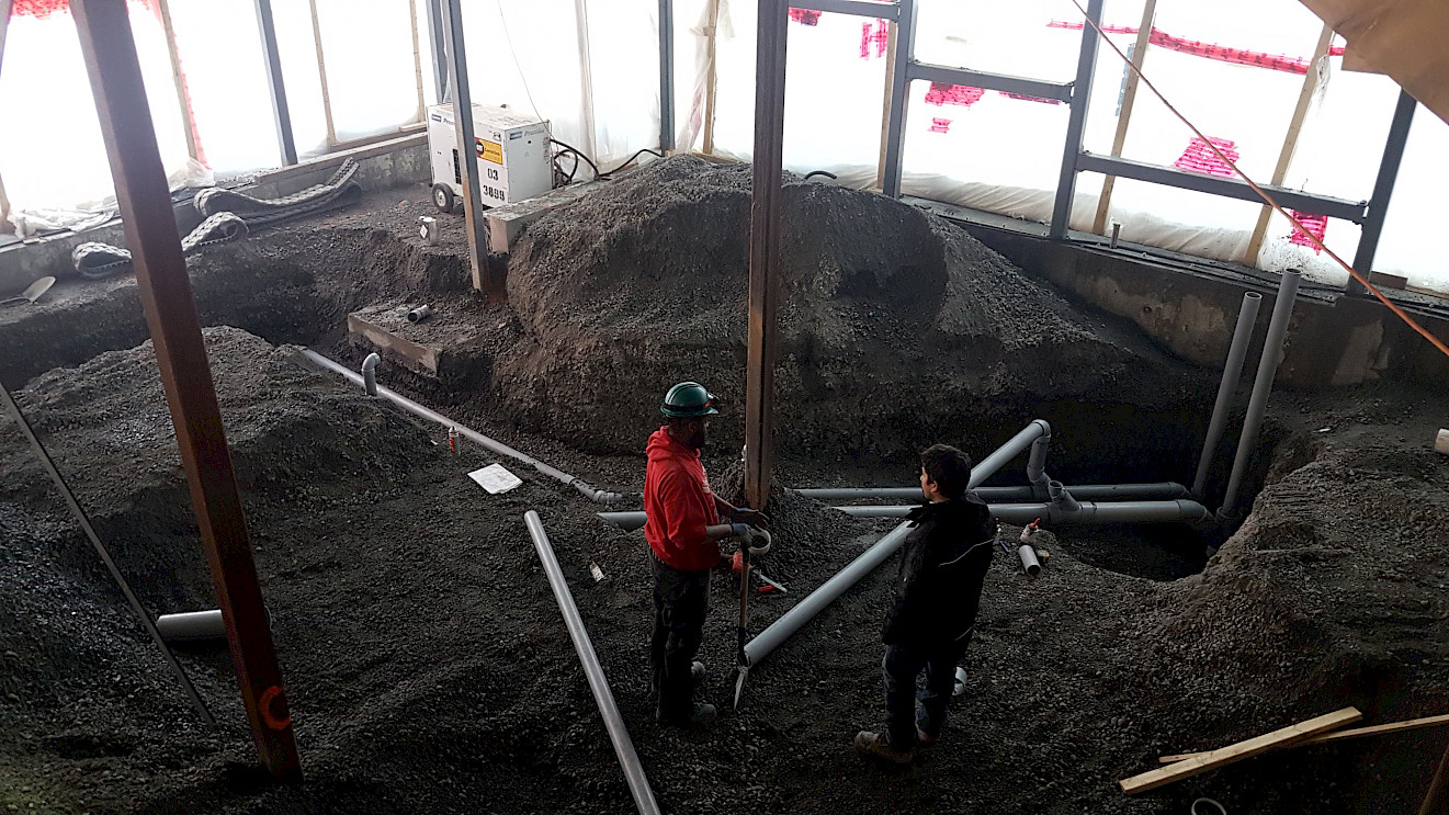 Pendant ce temps, tous les espaces de L’Illusion ont été décortiqués et des tranchées ont été creusées pour y laisser passer la tuyauterie du nouveau bâtiment. Au programme du chantier cet hiver : installation de la plomberie sous dalle et coulage de béton du 1er et du 2ème étage. Pas facile de se projeter dans ce pêle-mêle de tuyaux, mais les travaux avancent pas à pas et nous avons très hâte de passer à la prochaine étape!