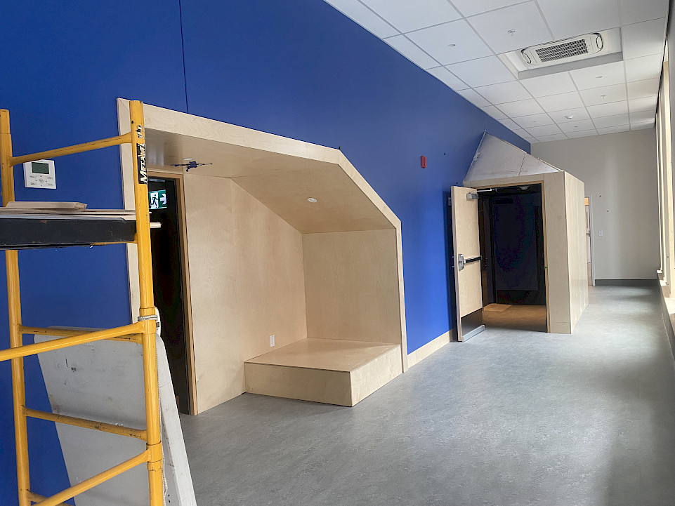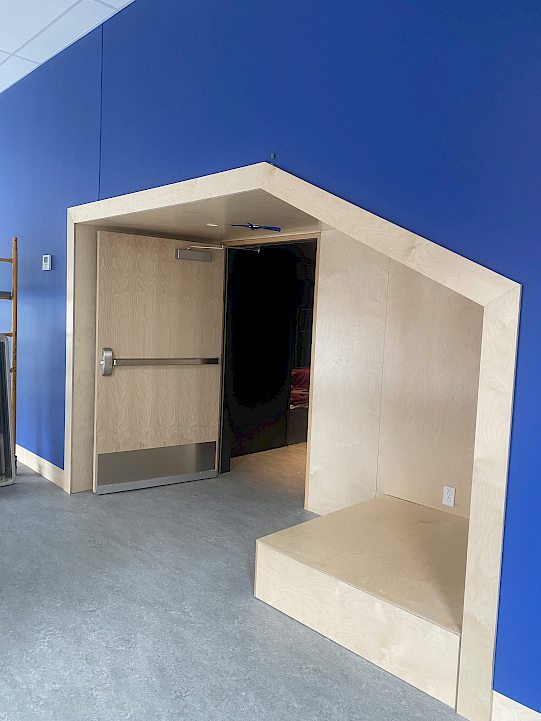 Vous les retrouverez dans l'espace d'accueil ainsi que dans la grande salle de spectacle, les menuiseries apportent la touche boisée qui manquait à notre forêt imaginaire! Remarquez-vous ces deux belles entrées de salles? Toute l'équipe de L'Illusion réfléchit actuellement à la meilleure façon de nommer les deux salles de spectacles et les entrées boisées de celles-ci nous inspirent beaucoup.