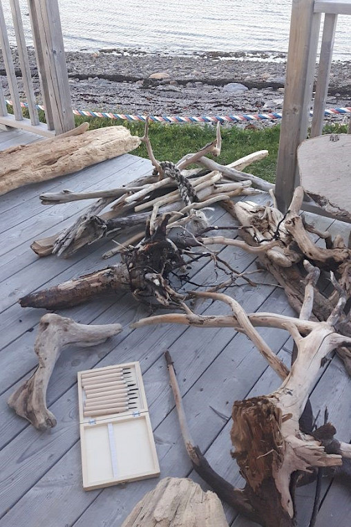 Depuis un moment déjà, quand nous rêvons à notre spectacle, nous imaginons des marionnettes faites en bois de grève. Intrigués depuis longtemps par la Fête du bois flotté, nous n’avons pu résister à la tentation et nous nous sommes arrêtés à Sainte-Anne-des-Monts pour nous inspirer de ses sculptures sur bois, vestiges des festivals passés.