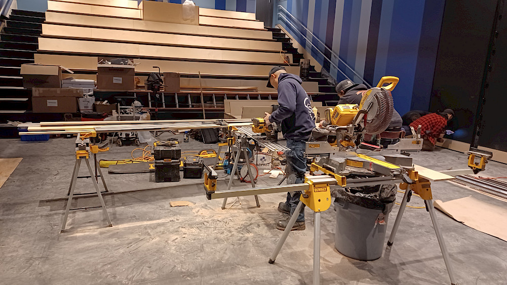 Dans les salles de spectacle, c'est l'heure de la pose des planchers! Il ne reste plus qu'à draper les murs de rideaux de velours noirs et installer les projecteurs afin de mettre en lumière les scénographies inventives des spectacles.