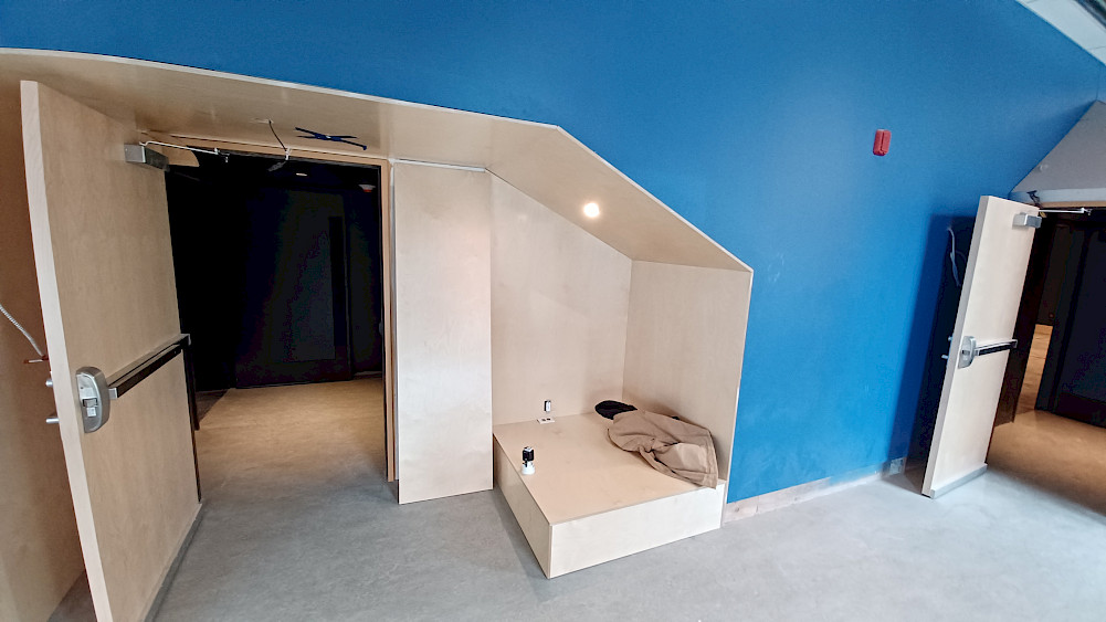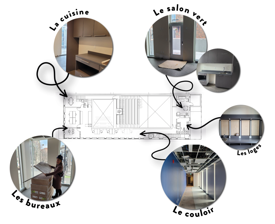 Au deuxième étage, qui abritera les bureaux administratifs, les loges et le salon vert, les planchers sont maintenant installés et le mobilier permanent est en train d'être finalisé. Bientôt nous y installerons les espaces de travail, une collaboration avec la dynamique équipe de De Gaspé dont l'atelier de fabrication est situé directement à Montréal, à moins de 7km de L'Illusion!