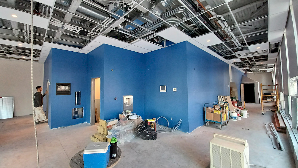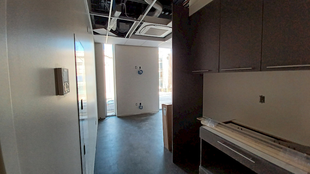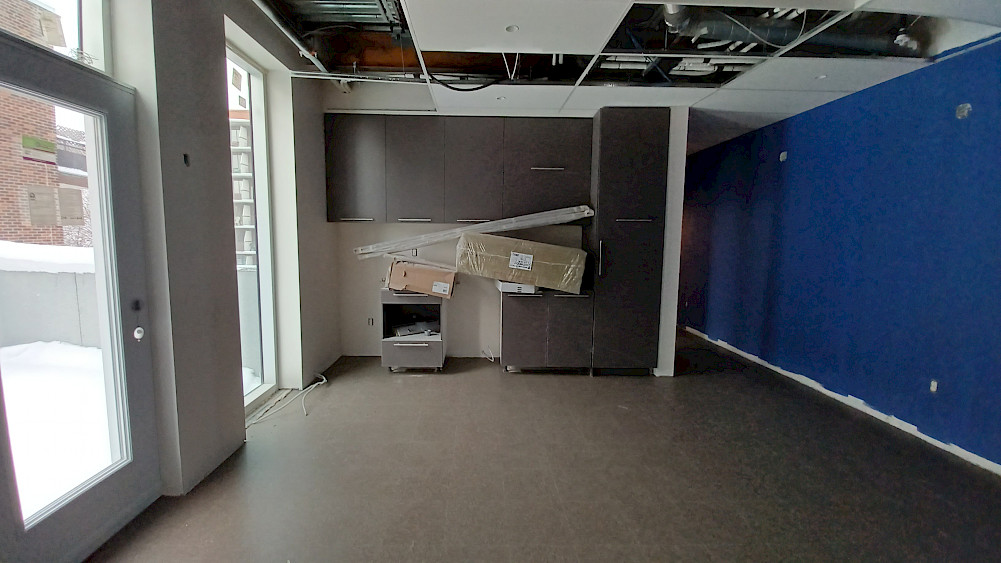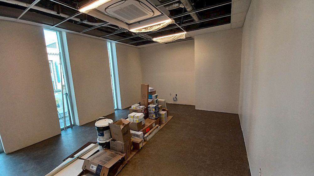 Au deuxième étage, qui abritera les bureaux administratifs ainsi que les loges des artistes, les étapes s'enchainent! Alors que les revêtements de sol sont en train d'être posés, les premiers éléments des cuisines communes commencent à être installés. Place maintenant aux finitions avant que toute l'équipe puisse y installer ses bureaux!