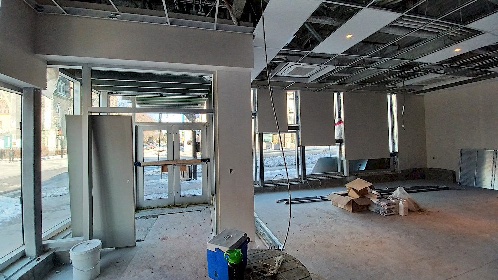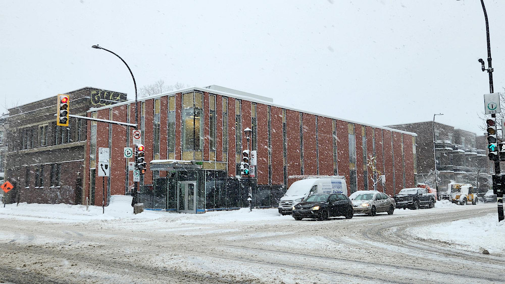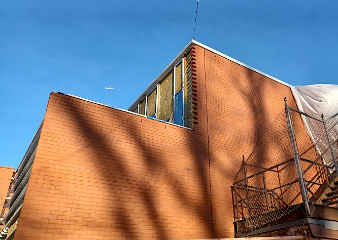 L'édifice est enfin recouvert de ses briques rouges! La façade côté Beaubien est désormais terminée, et la partie arrière du bâtiment donnant sur la ruelle verte devrait l'être prochainement. Le bâtiment est maintenant prêt à accueillir les plaques qui viendront se positionner dans la continuité des fenêtres et qui formeront ensemble les dernières lignes du plan architectural.