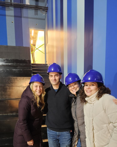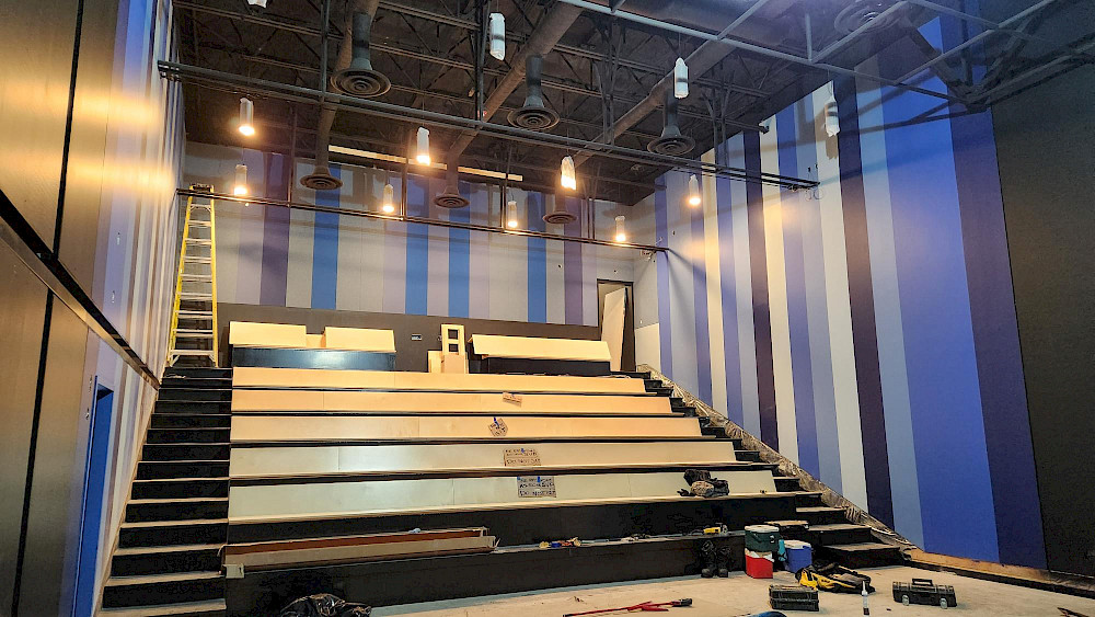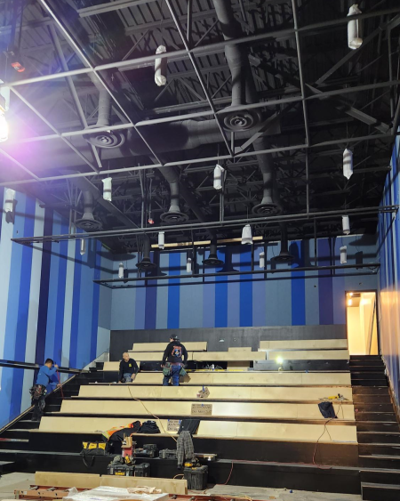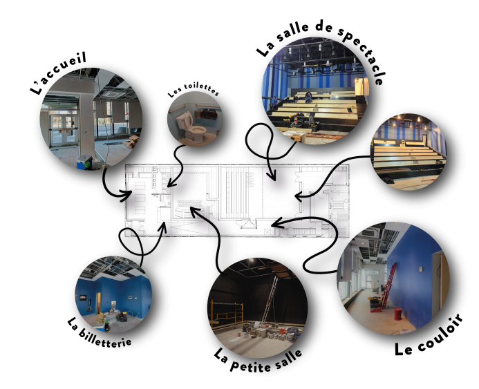 Au rez-de-chaussée, le chantier se poursuit dans tous les espaces! Pendant que les dernières étapes avancent dans le hall d'accueil et la billetterie, le carrelage et l'aménagement des toilettes sont presque terminés. Du côté des salles de spectacles, les murs se sont parés de leurs couleurs définitives et les gradins se sont revêtus de bois, ce qui donne vie aux dessins de notre architecte, Vladimir Topouzanov (à découvrir dans le précédent article).