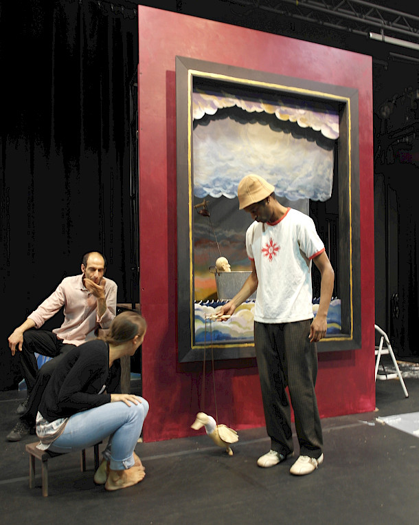 C'est un réel ballet qui se déroule à six mains qui prend place dans le castelet. Les marionnettistes doivent manipuler tous ensemble le même personnage ou encore être seul à en manipuler trois à la fois! Ils doivent aussi transformer l'espace scénique pour passer de l'Olympe à l'intérieur d'une petite chaumière. Tout ça, en évitant de se piler sur les pieds :) Ce ne sera pas tâche facile, mais avec beaucoup de travail et de répétitions, Salim, Sabrina et Philippe donneront merveilleusement vie aux marionnettes et à l'histoire de Philémon et Baucis!