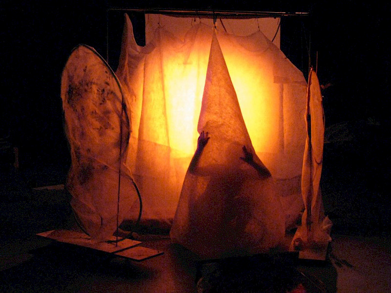 Lors de cette résidence, nous avons poussé plus loin l’intégration de la danse et de la marionnette dans un espace en constante transformation. Grâce aux lumières d’Audrey-Anne, nous avons expérimenté différentes possibilités lumineuses pour créer des atmosphères magiques et mystérieuses. Nous avons aussi testé les différentes proportions possibles des éléments scéniques tout en les liants à l’évolution du personnage principal et aux grandes étapes de notre récit.