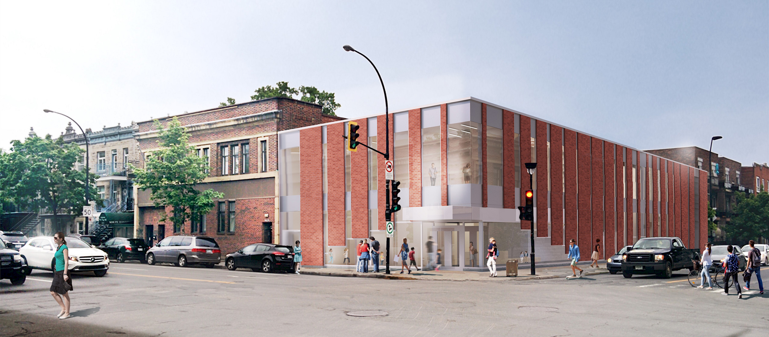 À la suite d’un appel d’offre public, la réalisation architecturale a été confiée à Saia Barbarese Topouzanov architectes (SBTA) qui a su créer une façade évoquant le symbole universel théâtral du rideau rouge, tout en s’intégrant à l’harmonie esthétique du quadrilatère. TetraTech (Ingénierie), Strategia Conseils (Gestion de projet), Go multimédia (Scénographie et équipement de scène) et Dinasa Construction (Entrepreneur général) complètent l’équipe du projet de construction.