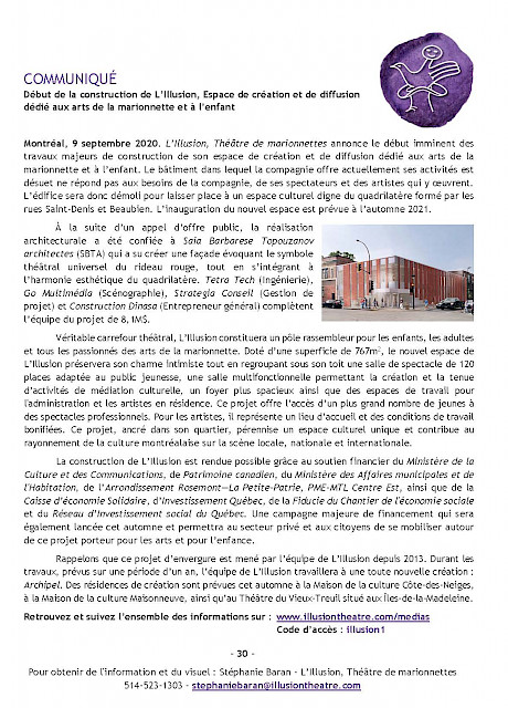 L’Illusion, Théâtre de marionnettes annonce le début imminent des travaux majeurs de construction de son espace de création et de diffusion dédié aux arts de la marionnette et à l’enfant. Le bâtiment dans lequel la compagnie offre actuellement ses activités est désuet ne répond pas aux besoins de la compagnie, de ses spectateurs et des artistes qui y oeuvrent. L’édifice sera donc démoli pour laisser place à un espace culturel digne du quadrilatère formé par les rues Saint-Denis et Beaubien. L’inauguration du nouvel espace est prévue à l’automne 2021.
