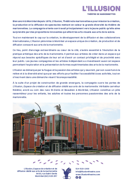 Bien ancré à Montréal depuis 1979, L’Illusion, Théâtre de marionnettes a pour mission la création, la production et la diffusion de spectacles mettant en valeur la grande diversité du théâtre de marionnettes. La compagnie oriente son travail principalement vers le jeune public qu’elle aime surprendre par des propositions innovantes qui allient les arts visuels aux arts de la scène.
