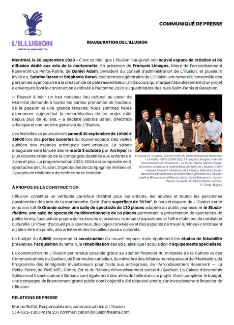 C’est ce midi que L'Illusion inaugurait son nouvel espace de création et de diffusion dédié aux arts de la marionnette. L’aboutissement d’un projet d’envergure dont la construction a débuté à l’automne 2020 au quadrilatère des rues Saint-Denis et Beaubien.