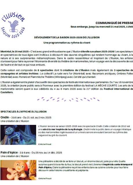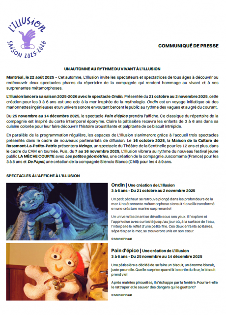 C’est avec grand enthousiasme que L’Illusion dévoile sa saison 2025-2026! Les spectateurs et spectatrices de tous âges sont invité.e.s à découvrir des œuvres singulières qui rendent hommage au vivant, à la nature et à ses surprenantes métamorphoses.