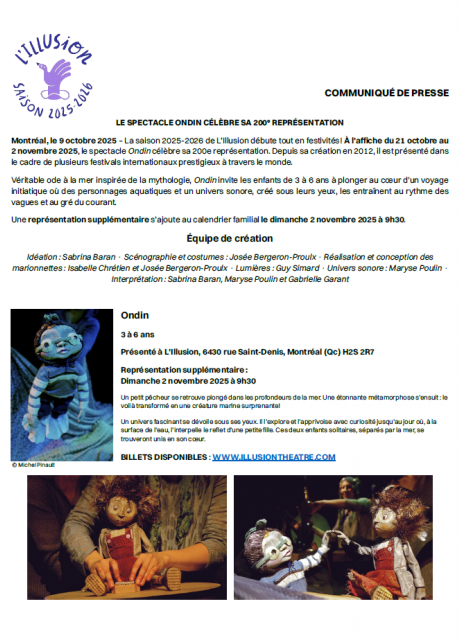 La saison 2025-2026 de L’Illusion débute tout en festivités! À l'affiche du 21 octobre au 2 novembre 2025, le spectacle Ondin célèbre sa 200e représentation.