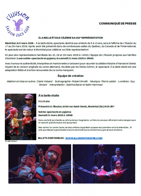 À la belle étoile, spectacle destiné aux enfants de 5 à 10 ans, sera à l’affiche de L’Illusion du 17 au 29 mars 2026. Après avoir été présenté dans de nombreuses salles du Québec, du Canada et de l'international, le spectacle est de retour à Montréal pour célébrer sa 250e représentation!