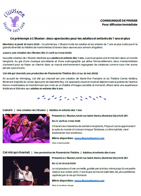 • 16/04/2024 - Ce printemps, L'Illusion présente deux spectacles pour les tout-petits!