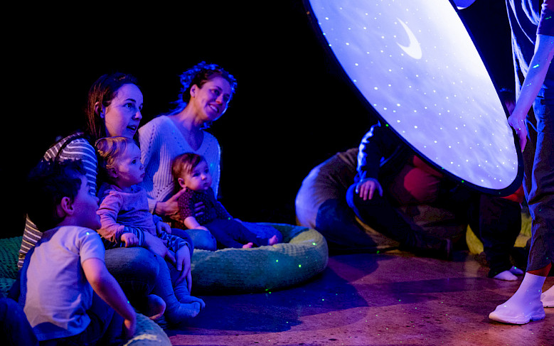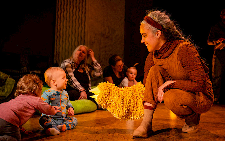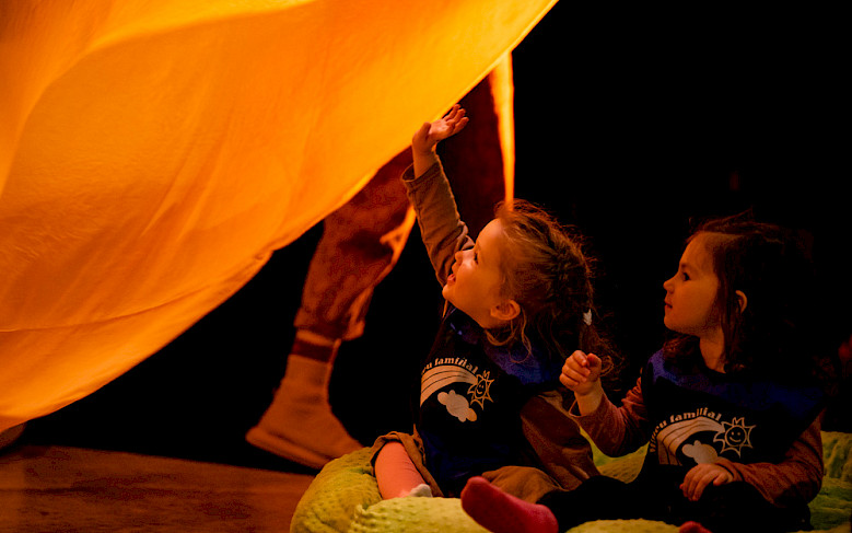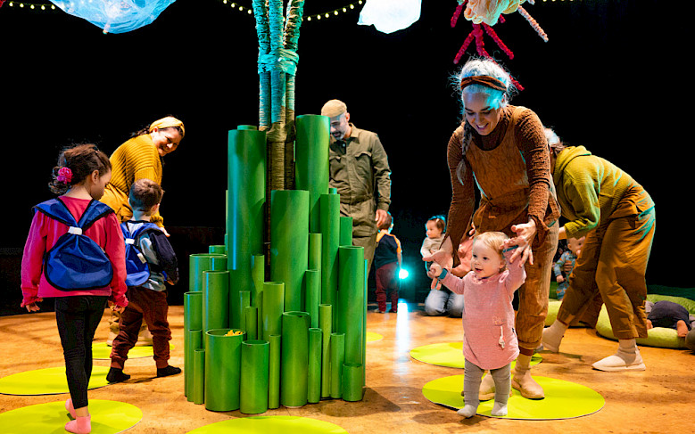 Arbre permet d’entrer dans un univers multi-sensoriel, pleinement interactif, enveloppé de lumière douce, de musique et aussi de silence, où cinq personnages interagissent avec les tout-petits.​